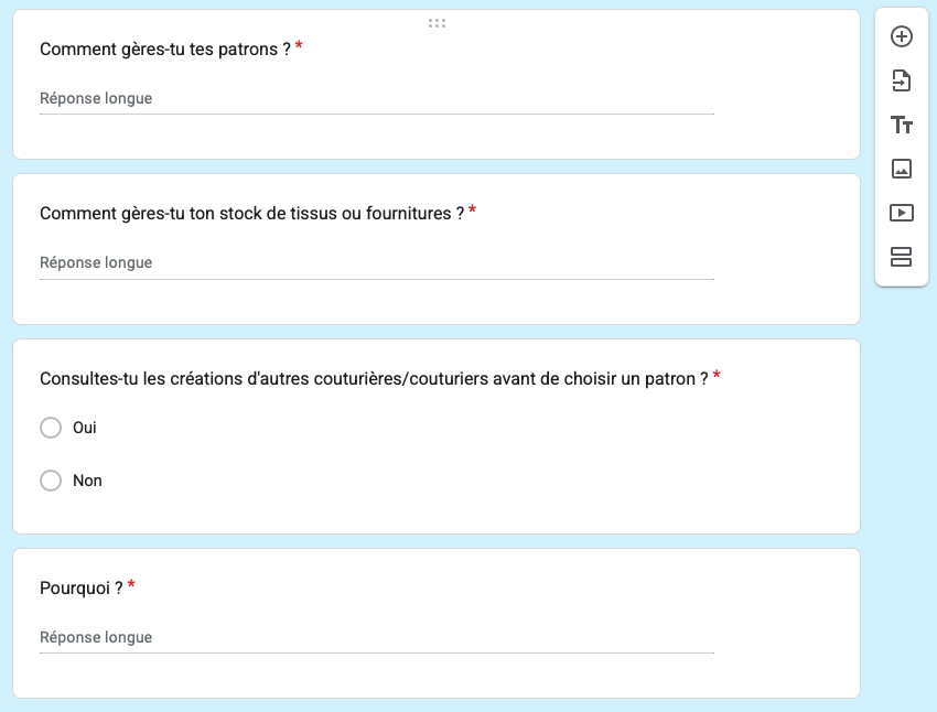 Après quelques discussions avec d’autres passioné.e.s, j’ai créé un Google Forms, que j’ai pu faire compléter par une centaine de personnes directement concernées.