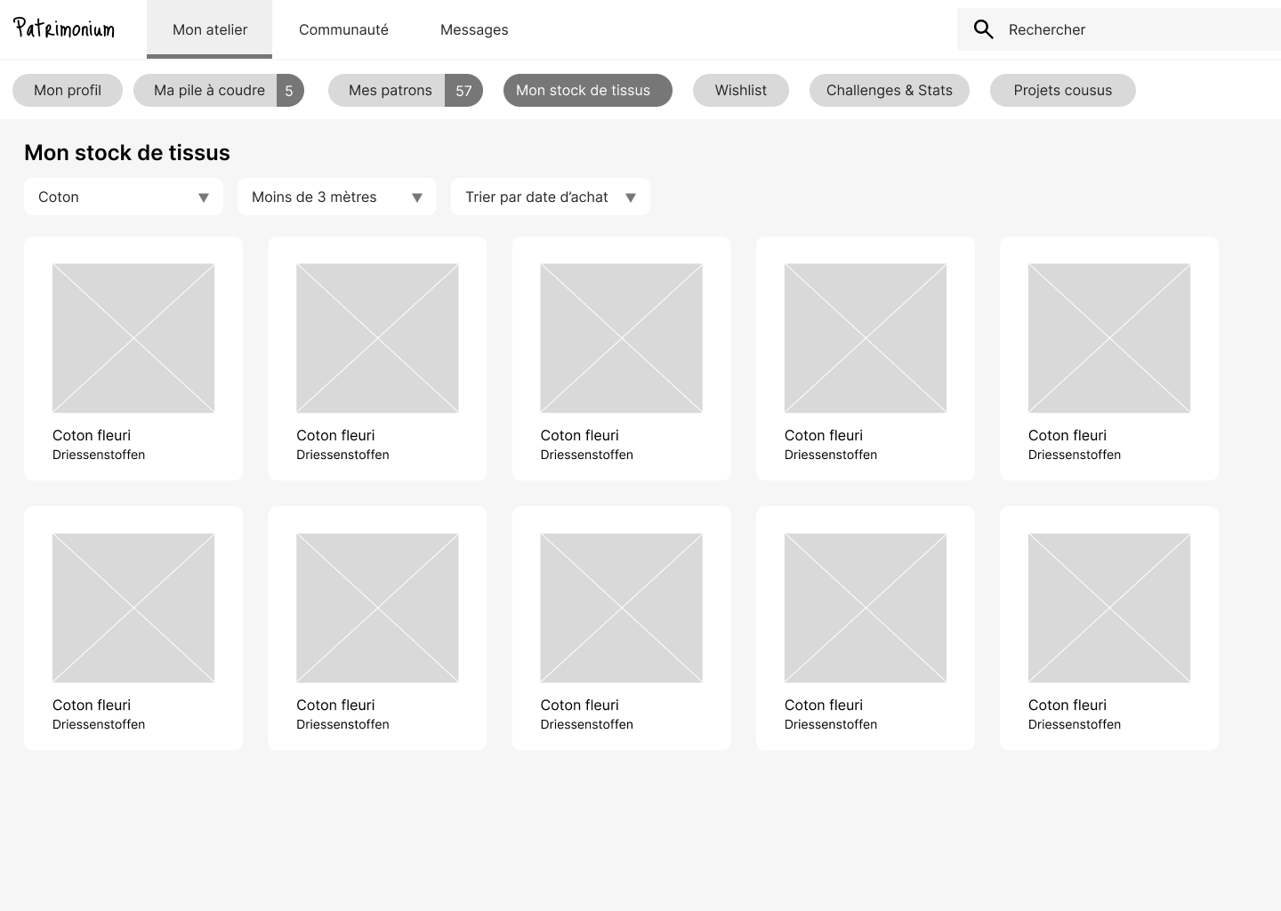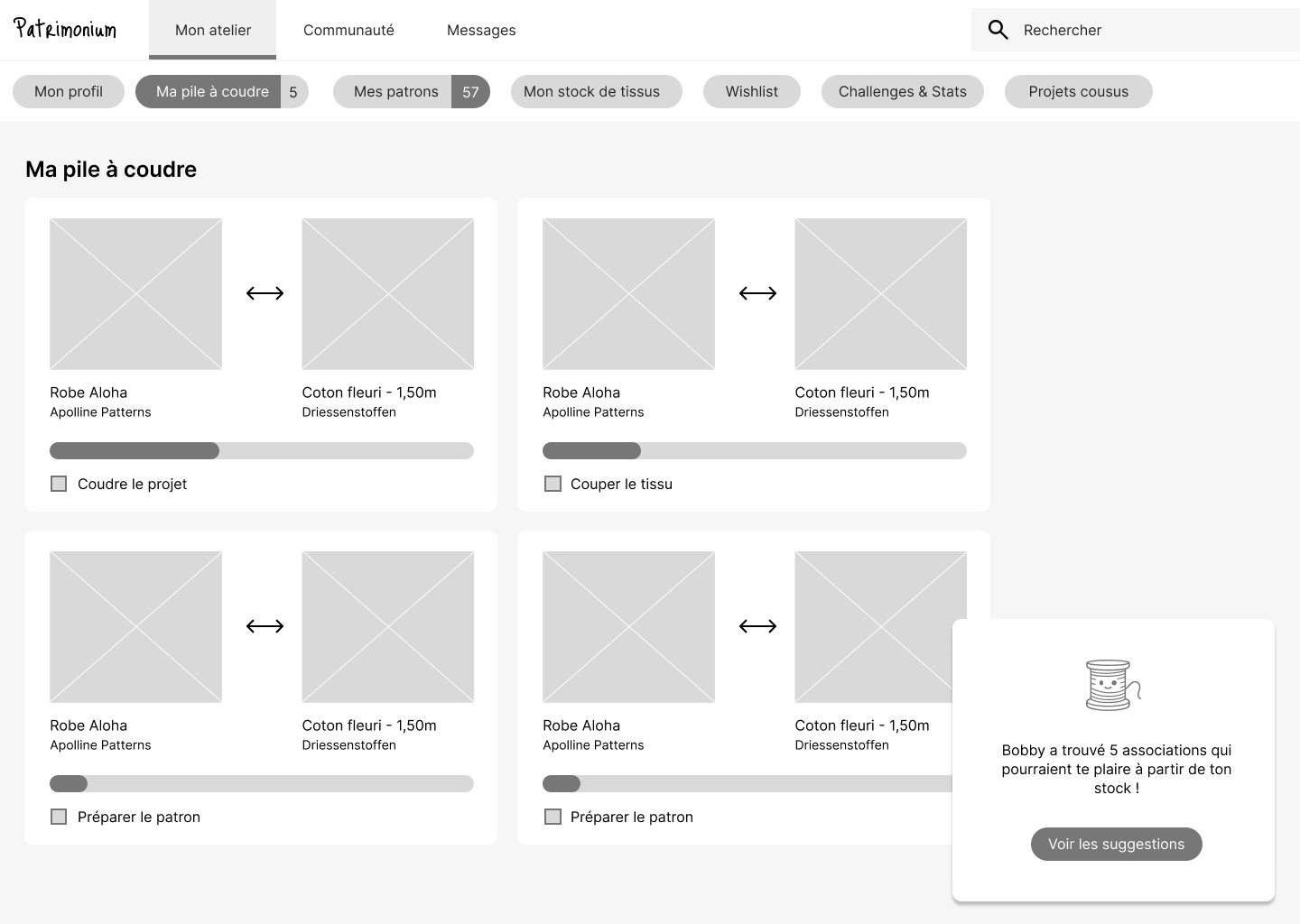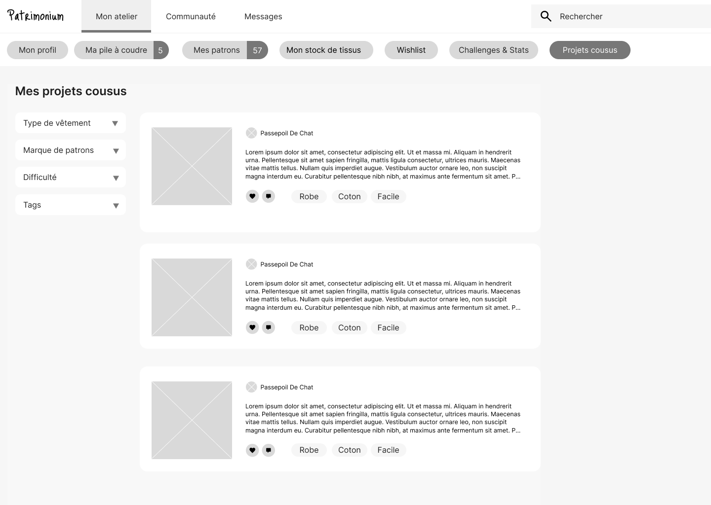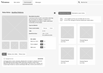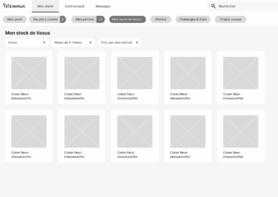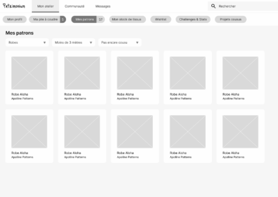OBJECTIF : une plateforme dédiée à la couture, qui permet de centraliser les patrons existants, d’y associer des créations, d’encoder son stock de tissus. Pouvoir voir, à un seul endroit, toutes les créations réalisées autour d’un patron. Une plateforme qui permet aussi de rencontrer d’autres passionnés, d’échanger.