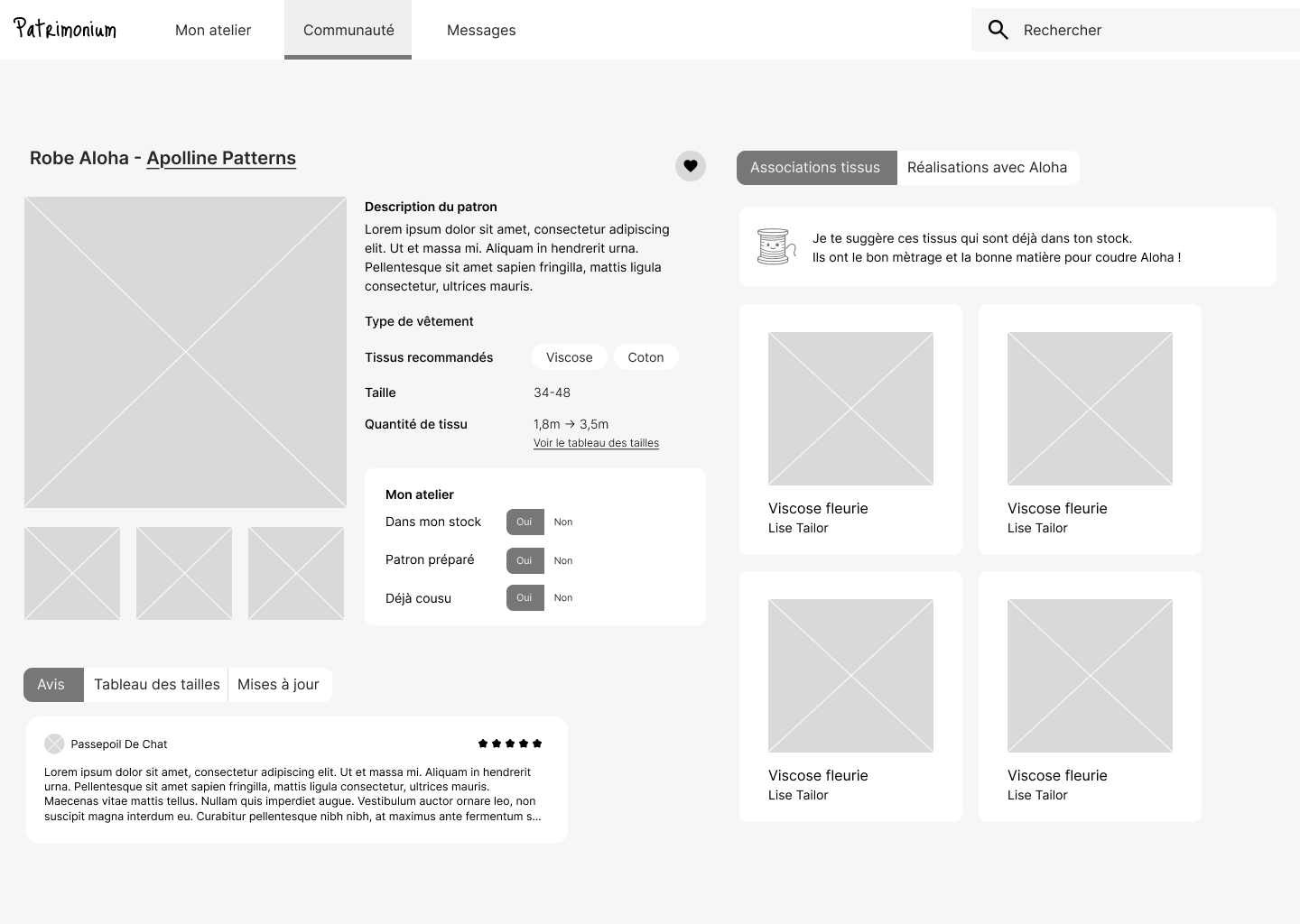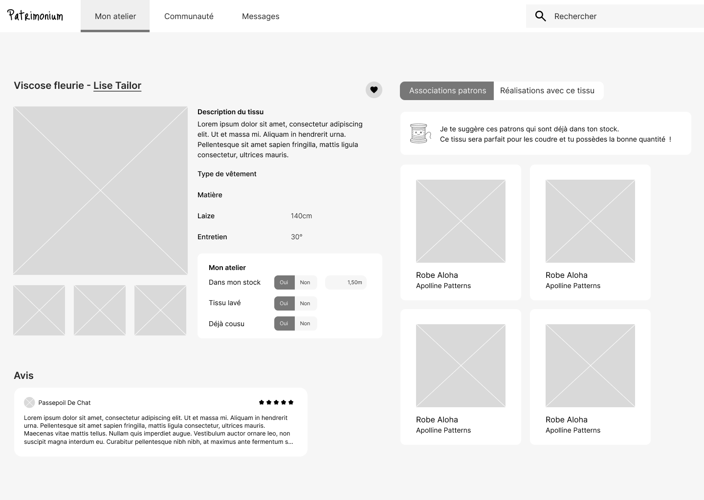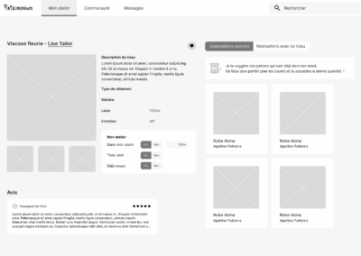 - Il est compliqué d’associer un tissu à un patron de façon claire et efficace : les outils actuels ne permettent pas de faire des choix éclairés en fonction du stock ou des caractéristiques des tissus.