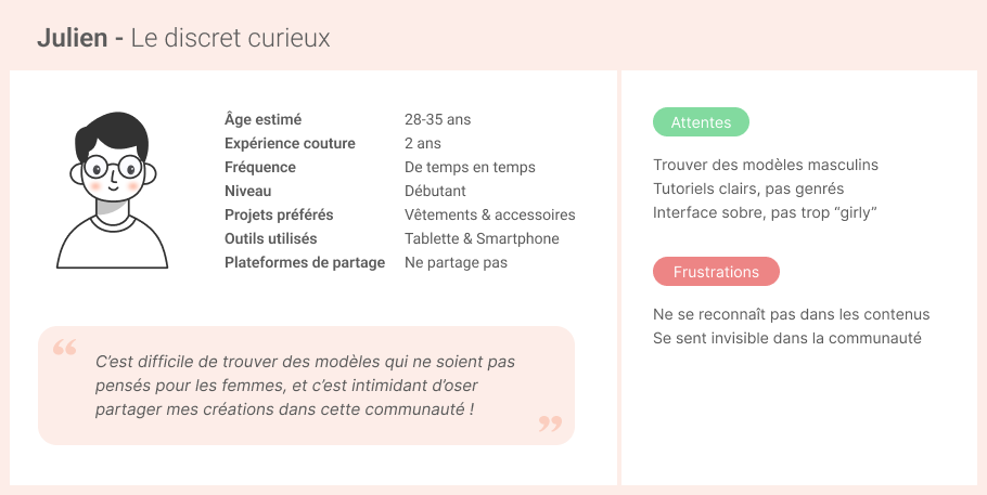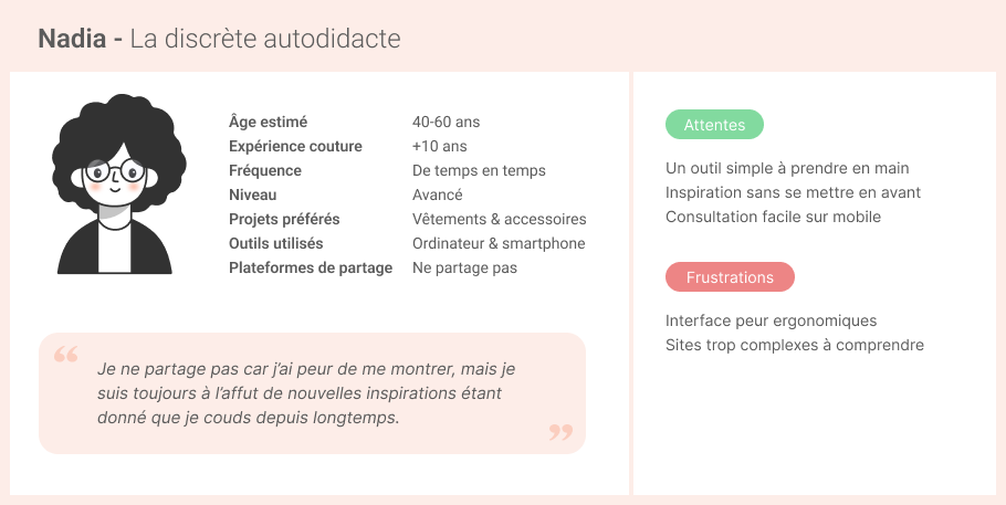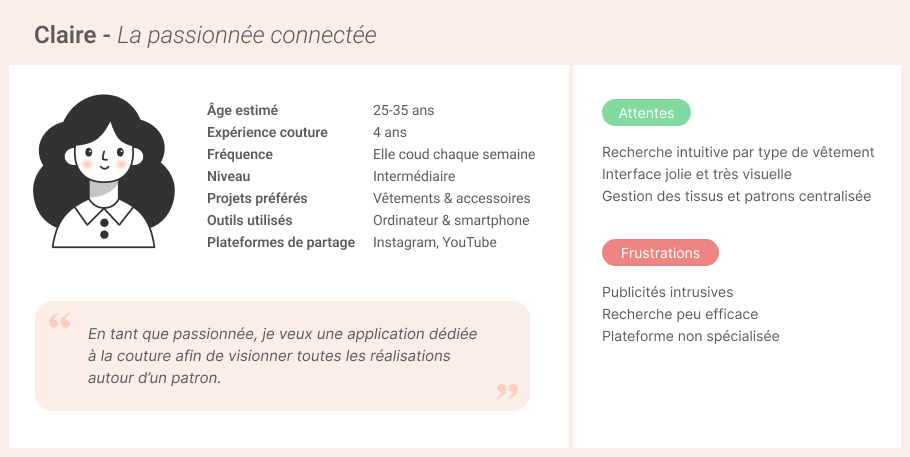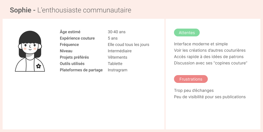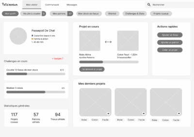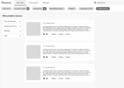 CONSTAT : Il n’existe pas aujourd’hui de réseau social ou de plateforme dédiée à la couture et accessible pour les francophones. Les couturières amatrices partagent leurs créations sur des blogs, Facebook, Instagram, etc. De plus en plus de couturières sont frustrées par ces plateformes qui ne sont pas vraiment adaptées au partage de la couture. Côté tricot, il existe une plateforme, Ravelry, qui permet de centraliser les patrons et créations des passionnés. Beaucoup de couturières aimeraient une plateforme similaire.